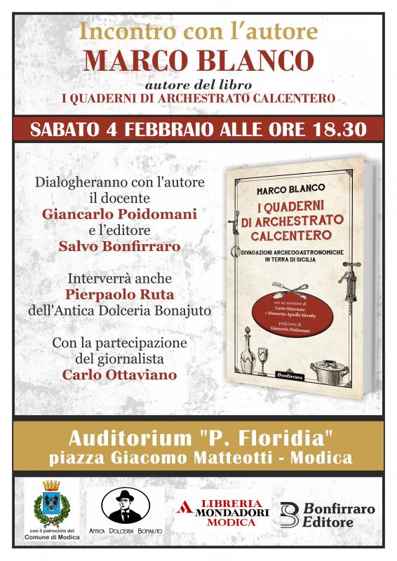 Il battesimo del libro “I Quaderni di Archestrato Calcentero – divagazioni archeogastronomiche in terra di Sicilia” si terrà, infatti, a Modica, città nella quale è nato, vive e lavora il suo giovane autore Marco Blanco, laureato in Lettere Classiche, libraio per professione e ricercatore per vocazione, che divide le sue giornate tra la passione per la lettura e la scrittura, la propria terra e l’archeologia.