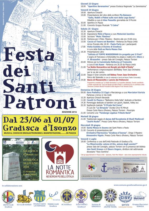 Festa dei Santi Patroni dal 23 giugno al 01 luglio 2016 a Gradisca d'Isonzo. Un ricco programma, con musica, chioschi enogastronomici, eventi, in occasione dei Santi Patroni della città.