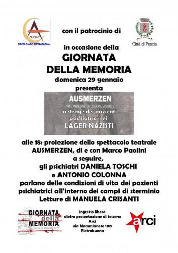 In occasione della Giornata della Memoria, con il patrocinio del Comune di Pescia, si ricorda la tragedia dei malati psichiatrici, 300mila dei quali sono scomparsi nei campi di concentramento nazisti. Proiettiamo AUSMERZEN, lo spettacolo teatrale scritto e interpretato da Marco Paolini, quindi Daniela Toschi e Antonio Colonna parleranno di quello che succedeva nei campi, e Manuela Crisanti leggerà un brano in cui Milena Jesenska, la donna amata da Franz Kafka morta nel campo di Ravensbruck, racconta la vita nei lager.