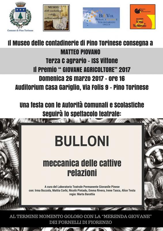 Il Museo delle contadinerie di Pino Torinese consegna il Premio "Giovane e agricoltore" 2017 a Matteo Piovano ,un ragazzo sedicenne che studia da contadino.che intende continuare una tradizione familiare,che mantiene vive le radici rurali del suo paese,che frequenta con successo la III C della sezione agraria dell'Istituto Istruzione Superiore Vittone di Chieri.