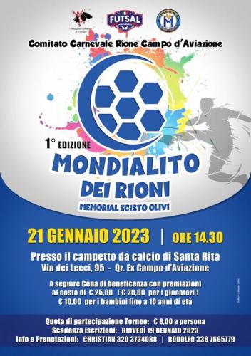 Presso il campetto da calcio della Parrocchia di Santa Rita, nel quartiere dell’ex Campo d’Aviazione di Viareggio, si terrà la prima edizione del Mondialito dei Rioni - Memorial Egisto Olivi, a partire dalle ore 14.30.