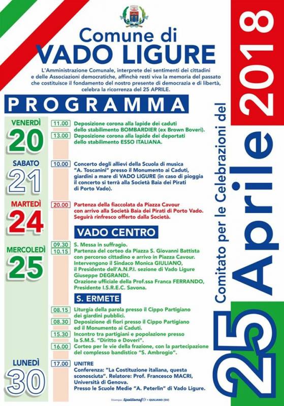 - Ore 10,15 partenza del corteo da Piazza San Giovanni Battista , con percorso cittadino e arrivo in Piazza Cavour. Interverranno il Sindaco Monica Giuliano e il Presidente dell'A.N.P.I. della Sezione di Vado Ligure Giuseppe Degrandi. Orazione Ufficiale della Professoressa Franca Ferrando, Presidente I.S.R.E.C. Savona.