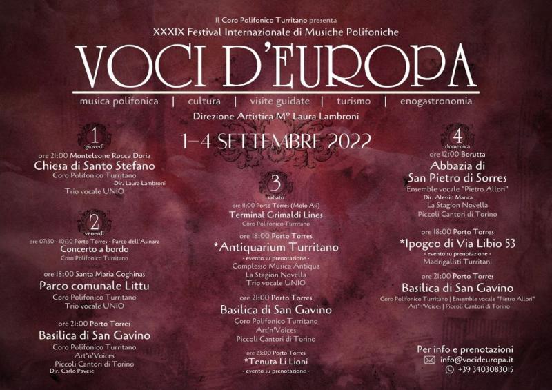 Dal 1° al 4 settembre, nel Nord Sardegna si terrà il Festival Internazionale di Musiche Polifoniche “Voci d’Europa”: il Festival corale più longevo della Sardegna. Il fulcro della manifestazione è la città di Porto Torres, con il coinvolgimento dell’Ente Parco dell’Asinara e i Comuni di Borutta, Monteleone Rocca Doria e Santa Maria Coghinas.