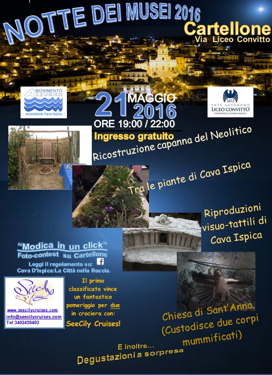 - Il Museo Visuo-Tattile di Cava Ispica: Il Movimento Azzurro di Modica ha assunto l’iniziativa di curare, valorizzare e proporre al mondo intero Cava d’Ispica, ma non tutti hanno la possibilità di visitare sul loco questo straordinario patrimonio. Pensando dunque alle persone diversamente abili, nasce un’idea rivoluzionaria: riprodurre i monumenti di Cava d’Ispica per un Museo nato per promuovere una conoscenza senza barriere, dedicata ai non vedenti, ai portatori di handicap motori, insomma a tutti colori che per motivi vari sono impossibilitati a scendere nella Cava, ovviamente sarà anche punto di riferimento per tutti coloro che vogliono conoscere in anteprima, le bellezze di Cava d’Ispica. Per la serata sarà allocato in una grotta di via Liceo Convitto.