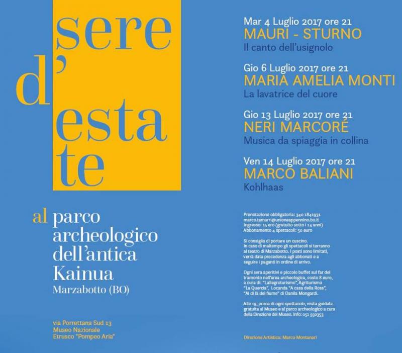 Nuova edizione delle Sere d’estate al parco archeologico dell’antica Kainua che ha come palcoscenico l’area archeologica di Marzabotto. Continuando una tradizione ormai consolidata, la kermesse –realizzata in collaborazione con la Soprintendenza Archeologia, belle arti e paesaggio di Bologna- consente di rivivere l'antica consuetudine degli spettacoli pubblici immersi in uno scenario fuori dal tempo dove la bellezza della natura si sposa al fascino dell'antica città etrusca.