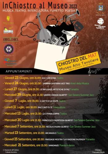 E’ partito lo scorso 23 giugno, presso il Chiostro del MAT Museo dell’Alto Tavoliere di San Severo, la rassegna estiva “InChiostro al Museo” edizione 2022, una serie di eventi che animeranno l’estate al museo. La rassegna rientra nella programmazione estiva a cura dell’Amministrazione Comunale e dell’Assessorato alla Cultura del Comune di San Severo. Un cartellone ricco di proposte molto varie, che vanno dal Teatro alla Musica, dal Fumetto alla Danza, dall’Intercultura alla Poesia, realizzato in collaborazione con: Amici del Jazz – San Severo, Associazione Culturale Spazio Off, Amici della Musica – San Severo, l’Associazione Gentilezza è Cultura – San Severo e la Consulta delle Associazioni – San Severo.