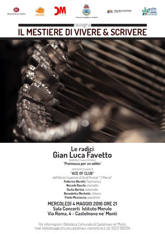 Spiega l'Assessore alla Cultura, Emanuele Ferrari: “Partiamo con un gradito ritorno in questa rassegna di primavera dedicata ai libri, alla poesia della vita e della scrittura. Gian Luca Favetto ha scelto Castelnovo Monti per presentare il suo ultimo romanzo, Premessa di un addio, uscito il 20 aprile. Come già nel caso de La vita non fa rumore, andato in scena sul palco del teatro qualche anno fa, sarà accompagnato da un gruppo di allievi del nostro Istituto Merulo. Un reading che esplora l'universo di uno dei nostri grandi narratori: viaggio nello spazio e nel tempo, luoghi concreti e simbolici, esplorazioni del proprio vissuto che contiene tracce e segni di un universale abitare il mondo, come se davvero la vita di ciascuno potesse diventare un tassello essenziale per la vita di tutti. La rassegna proseguirà poi nel mese di maggio con altri due appuntamenti, il primo dei quali il 10 maggio, in collaborazione con il gruppo Liberamente, che vedrà protagonista Maurizio Maggiani. Vogliamo proseguire in questo cammino che mette in contatto biblioteca e autori, cittadini appassionati di letteratura, allievi del corso di autobiografia giunto alla terza edizione e l'approfondimento sulle "vite degli altri", per rendere più vicino e concreto il senso di comunità che nasce e si consolida in ogni gesto di racconto”.