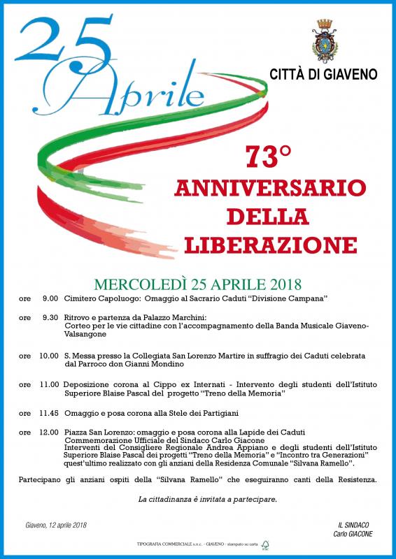 Ricorre il 73° Anniversario della Liberazione. L’Amministrazione Comunale organizza per mercoledì 25 Aprile il programma commemorativo che coinvolge gli studenti dell’Istituto Superiore Blaise Pascal di Giaveno e gli anziani della residenza comunale “Silvana Ramello”.