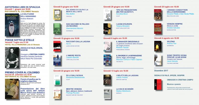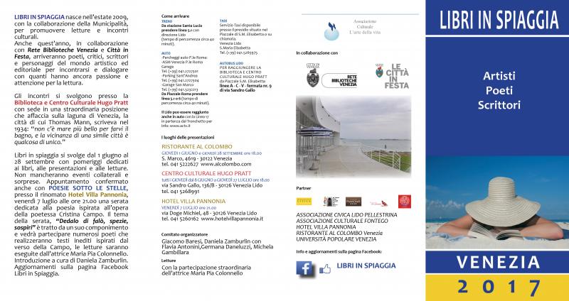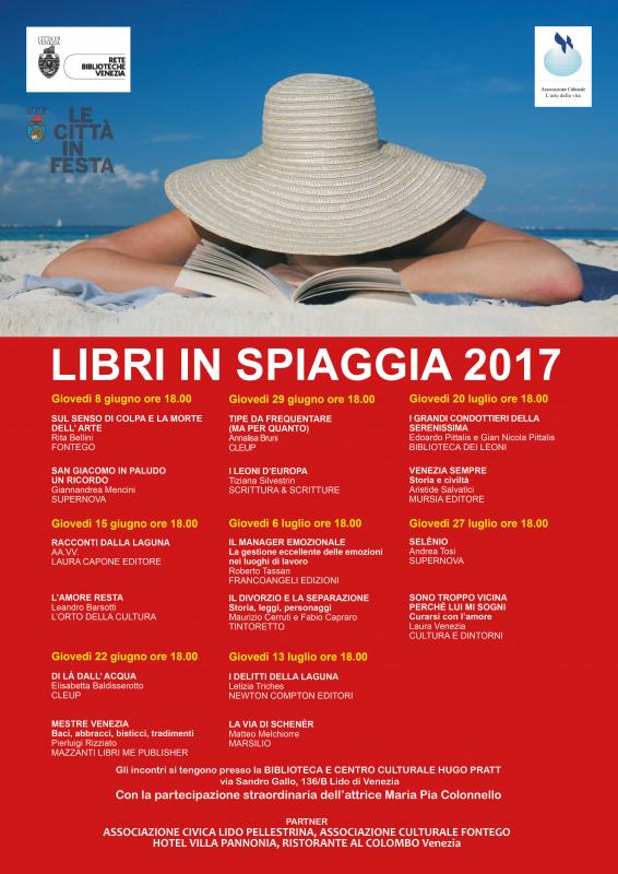 Torna anche quest’anno l’atteso appuntamento con Libri In spiaggia. Gli amanti della lettura e della poesia potranno assistere a numerosi appuntamenti che si svolgono al Lido e Venezia centro storico. Dall'8 giugno al 27 luglio, tutti i giovedì alle ore 18.00, gli appuntamenti letterari si terranno invece presso la Biblioteca e Centro Culturale Hugo Pratt in via Sandro Gallo al Lido di Venezia. Saranno organizzati incontri, dibatti e approfondimenti che offrono al pubblico un panorama vivace e significativo di autori contemporanei. Viene confermato per venerdì 7 luglio alle ore 21.00 l’incontro di Poesie sotto le stelle presso l’Hotel Villa Pannonia, una serata dedicata alla poesia ispirata in questa nona edizione all’opera della poetessa Cristina Campo. Il tema della serata “Dedalo di falò, spezie, sospiri”. è tratto da un componimento della scrittrice bolognese prematuramente scomparsa nel 1977. La relazione introduttiva sarà curata dalla giornalista Daniela Zamburlin. Parteciperanno alla serata numerosi poeti con testi inediti ispirati al verso della Campo, le letture saranno eseguite dall’attrice Maria Pia Colonnello.
