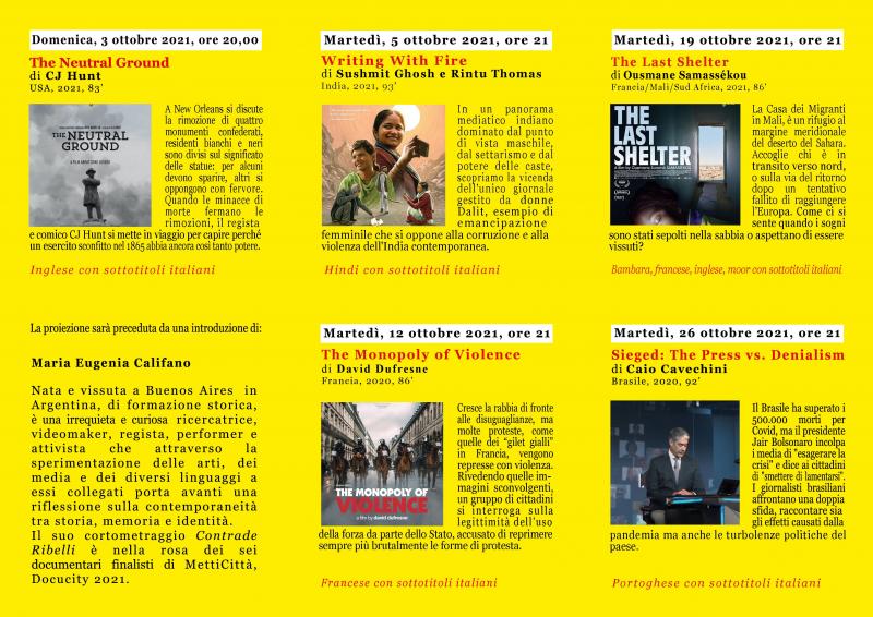 Si parte domenica 3 ottobre alle 20 con la proiezione di The Neutral Ground di CJ Hunt. Il film documenta la discussione tra residenti bianchi e neri per quanto riguarda il significato di quattro monumenti confederati a New Orleans. Per alcuni essi devono scomparire, mentre altri si oppongono con fervore. Quando le minacce di morte fermano le rimozioni, il regista e comico CJ Hunt si mette in viaggio per capire perché un esercito sconfitto nel 1865 abbia ancora così tanto potere. Il primo incontro verrà introdotto da Maria Eugenia Califano, ricercatrice, videomaker, regista, performer e attivista che attraverso la sperimentazione delle arti, dei media e dei diversi linguaggi a essi collegati porta avanti una riflessione sulla contemporaneità tra storia, memoria, e identità. Il suo cortometraggio Contrade Ribelli, è nella rosa dei documentari finalisti di MettiCittà, Docucity 2021.