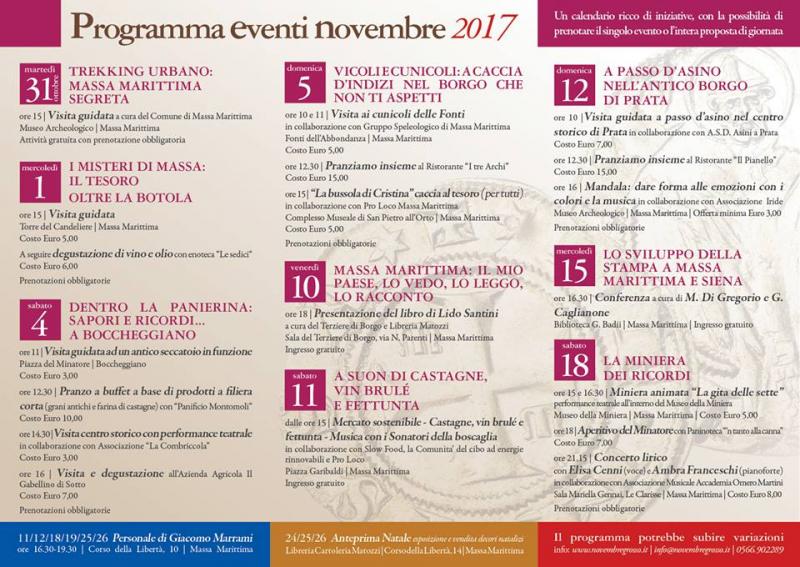 Anche quest’anno nelle Colline Metallifere sarà “Novembre Grosso”: concerti, spettacoli e visite guidate alla scoperta di sapori tradizionali, mestieri antichi e di tutta la storia e l’arte racchiusa tra vie, monumenti e cunicoli della città. Da martedì 31 ottobre iniziano gli appuntamenti organizzati dalla Cooperativa Colline Metallifere, in collaborazione con il Comune di Massa Marittima e con le associazioni locali.