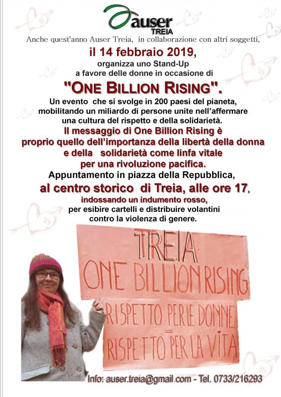 Anche quest'anno Auser Treia, in collaborazione con altri soggetti, il 14 febbraio 2019, organizza uno Stand-Up a favore delle donne in occasione di "One Billion Rising". Un evento che si svolge in 200 paesi del pianeta, mobilitando un miliardo di persone unite nell’affermare una cultura del rispetto e della solidarietà. Il messaggio di One Billion Rising è proprio quello dell’importanza della libertà della donna e della solidarietà come linfa vitale per una rivoluzione pacifica.