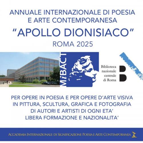 Accademia Internazionale di Significazione Poesia e Arte Contemporanea, polo no profit di libera creazione, ricerca e significazione del linguaggio poetico e artistico, in convenzione formativa con l’Università degli Studi di Roma Tre, accreditata dalla Regione Lazio, iscritta all’albo di Roma Capitale e del Comune di Canale Monterano e promossa dall’Istituto Italiano di Cultura di New York, bandisce il Premio Accademico Internazionale di Poesia e Arte Contemporanea Apollo dionisiaco, XII Edizione Roma 2025, senza scopo di lucro.
