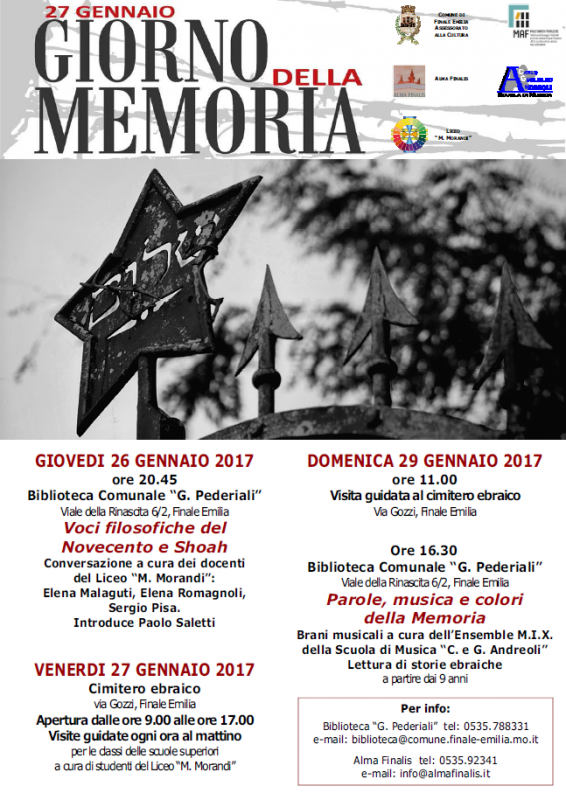 Il 27 gennaio, come ogni anno, ricorre il Giorno della Memoria che ricorda le vittime dell'Olocausto. Il programma delle celebrazioni che Comune di Finale Emilia, Biblioteca Comunale Giuseppe Pederiali, Alma Finalis, Fondazione Scuola di Muscia C. e G. Andreoli e Liceo Scientifico Morando Morandi hanno organizzato si articola su tre giornate: