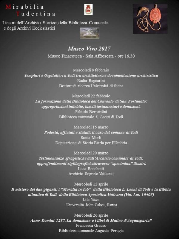 Inizia mercoledì 8 febbraio 2017 la decima stagione del ciclo di conferenze “Museo Vivo”, iniziativa organizzata dall’Assessorato alla Cultura del Comune di Todi, dalla direzione del Circuito Museale della Città di Todi, dell’Archivio Storico Comunale e della Biblioteca Comunale “Lorenzo Leoni”.