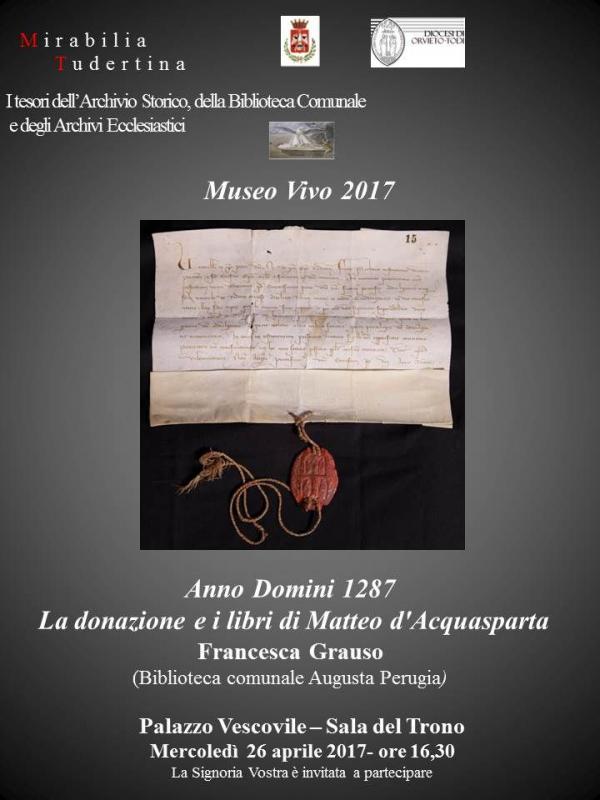 La conferenza “Anno Domini 1287. La donazione e i libri di Matteo d’Acquasparta”, a cura della dott.ssa Francesca Grauso, responsabile del Fondo manoscritti della Biblioteca comunale Augusta di Perugia, sarà l'occasione per vedere immagini dei manoscritti ancora conservati nella Biblioteca di Todi, soffermandosi sulla particolarissima scrittura di Matteo d’Acquasparta, ma anche per seguire, attraverso i suoi libri, il percorso di studi di un frate del XIII secolo.