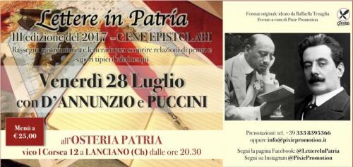 L'ultima cena epistolare della terza edizione di Lettere in Patria si avvicina! La rassegna gastronomico-culturale, ideata da Raffaella Tenaglia, a cura di Pixie Promotion e realizzata alla Osteria Patria Lanciano (Ch), si conclude venerdì 28 luglio con la corrispondenza tra il Vate Gabriele D'Annunzio e il celebre compositore Giacomo Puccini. La pubblicazione di riferimento per scoprire particolari interessanti del rapporto creativo e umano tra i due artisti è "Gabriele D'Annunzio Giacomo Puccini - Il carteggio recuperato (1894-1922)" della Casa Editrice Rocco Carabba, 2009.