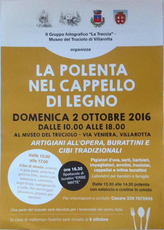 4° Festa Della Polenta Nel Cappello Di Legno il 2 ottobre 2016 al Museo del Truciolo di Villarotta di Luzzara (RE) con artigiani all'opera, burattini e cibi tradizionali.