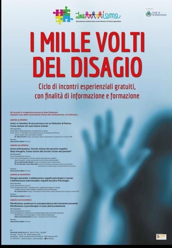 “COME AIUTARE CHI SOFFRE DI DISTURBO DI PANICO”, rivolto soprattutto a chi vive accanto a persone che vivono questi disagi. Pur essendo animati da affetto e da desiderio di essere di aiuto non è sempre facile per i familiari e per gli amici comportarsi in modo costruttivo, sapere cosa fare in certe situazioni o come rispondere a determinate richieste. L'intento dell'incontro è quello di condividere l'esperienza e le informazioni che si sono dimostrate una valida guida per facilitare la gestione dei problemi quotidiani dichi vive accanto a chi soffre di disturbo di panico.