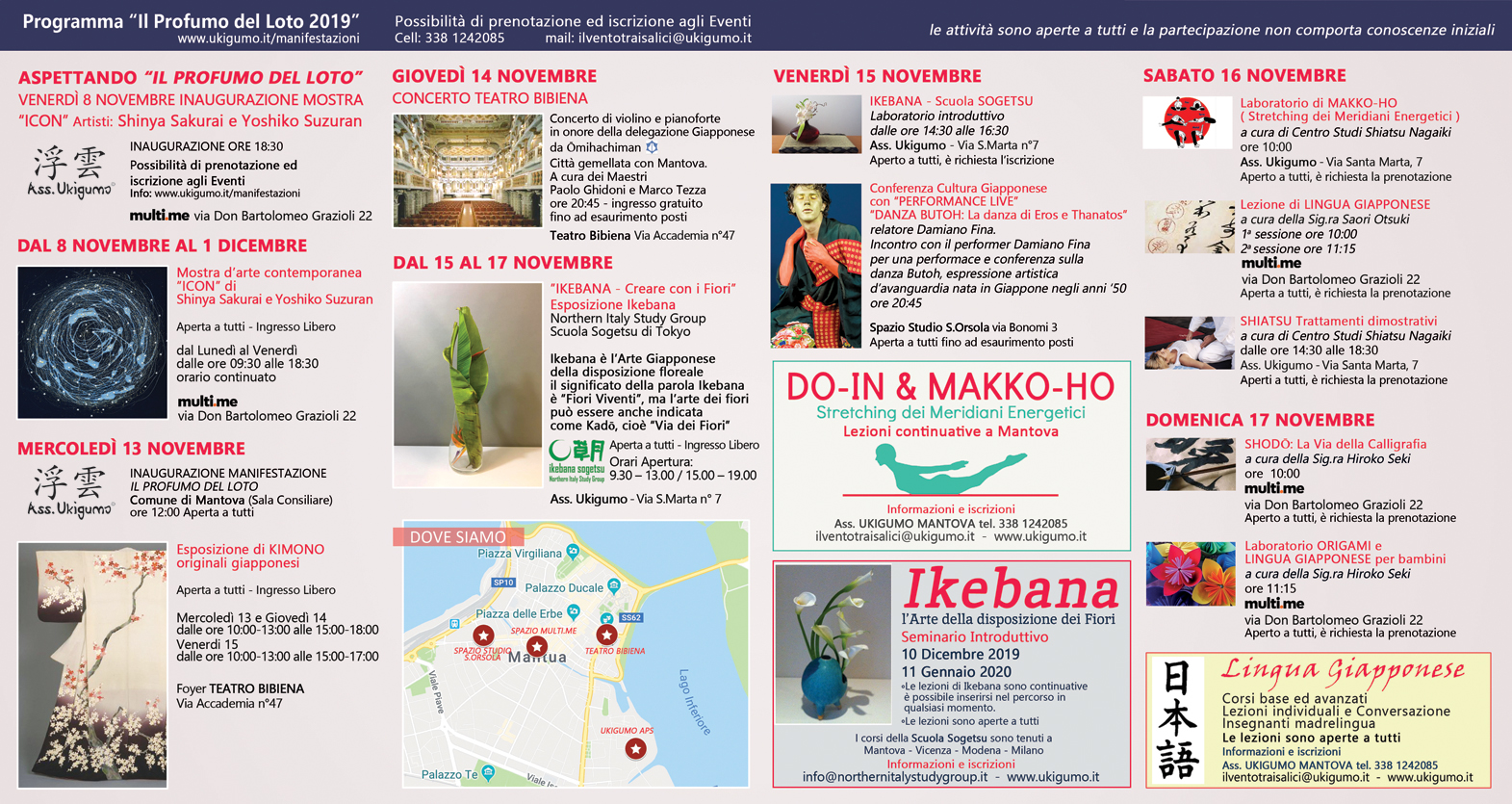 All’interno dell’evento verranno proposti workshop gratuiti di Lingua Giapponese, Shodo (Arte della calligrafia), Shiatsu, Ikebana, Origami per bambini, Trattamenti dimostrativi di Shiatsu, Pratica di Do-In e Makko-HO, esposizione di Ikebana a cura del Northern Italy Study Group Scuola Sogetsu di Tokyo, "ICON" mostra d’Arte Contemporanea di Artisti Giapponesi, conferenza e performance Danza Butoh. Le attività dell’Evento si svolgeranno in varie location di Mantova: Via Santa Marta, 7 (sede di UKigumo Aps), spazio multi.me via Don Bartolomeo Grazioli 22, Teatro Bibiena Via Accademia 47, Spazio Studio Sant'Orsola via Bonomi,3.