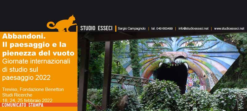 Venerdì 18, giovedì 24 e venerdì 25 febbraio 2022 la Fondazione Benetton Studi Ricerche propone online, sulla piattaforma Zoom, la diciottesima edizione delle Giornate internazionali di studio sul paesaggio, dedicate al tema Abbandoni. Il paesaggio e la pienezza del vuoto, a cura di Luigi Latini (presidente del Comitato scientifico) e Simonetta Zanon (progetti paesaggio).