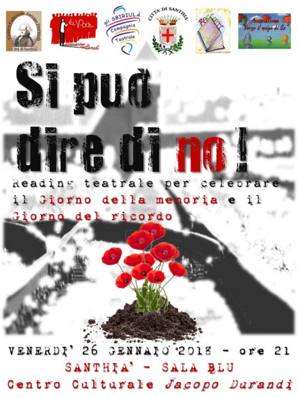 'Si può dire di no!’: è questo il titolo del reading proposto dalla compagnia teatrale ‘Gli Sbiriulà’ e dall’Associazione Culturale ‘La Voce’, realizzato grazie alla preziosissima collaborazione dell’Associazione ‘Racconti’, della ‘Nuova compagnia teatrale alicese’ di Alice Castello e dell’Associazione ‘Verso il Mago di Oz’. Una grande sinergia tra realtà territoriali diverse ma accomunate dal desiderio di voler celebrare il ‘giorno della memoria’ e il ‘giorno del ricordo’ con parole, colori, gesti e immagini. L’evento, patrocinato dall’Amministrazione comunale di Santhià e fortemente voluto dall’Assessore alla Cultura Renzo Bellardone, è diventato ormai da qualche anno a questa parte un appuntamento fisso. Attraverso il teatro si vuole infatti cercare di non far dimenticare i terribili eventi legati alla seconda guerra mondiale che hanno colpito anche i nostri connazionali, lanciando allo stesso tempo un messaggio di speranza e di pace alle nuove generazioni, anche attraverso l’esempio della collaborazione e della condivisione tra associazioni. La grande novità di quest’anno sarà inoltre la presenza in scena dei giovani ragazzi che stanno frequentando il laboratorio teatrale tenuto presso l’oratorio di San Grato ed organizzato in collaborazione con la Parrocchia. Verrà infatti data loro la possibilità di potersi esibire per la prima volta in una grande occasione e sotto la guida di Alessandra Momo e Michela Iacono.