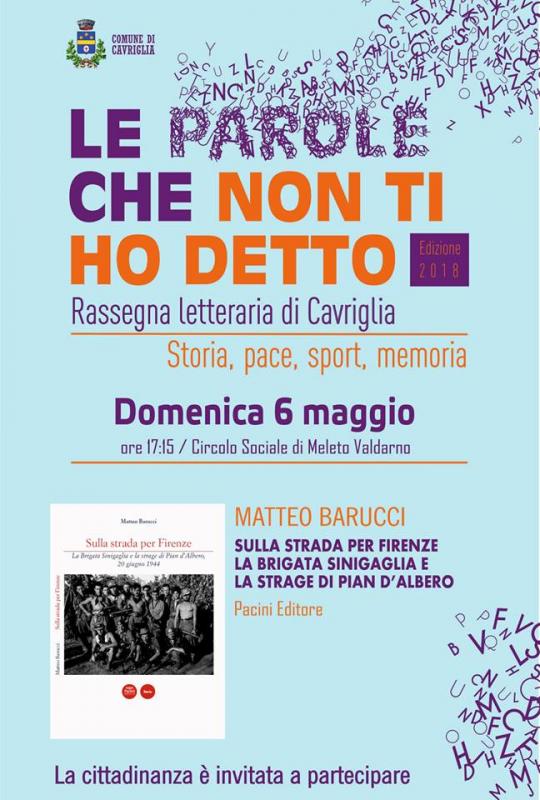 Prossimo appuntamento della terza edizione della RASSEGNA LETTERARIA “LE PAROLE CHE NON TI HO DETTO” in programma DOMENICA 6 MAGGIO alle 17 e 15 nella AL CIRCOLO SOCIALE DI MELETO dove avverrà la presentazione di “Sulla strada per Firenze. La Brigata Sinigaglia e la strage di Pian d'Albero”, il libro di MATTEO BARUCCI dedicato alla storia dell’Eccidio Nazifascista di Pian d’Albero.