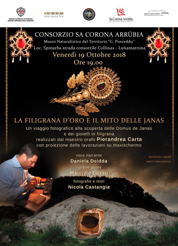 Venerdì 19 ottobre 2018 alle ore 19.00, presso il Museo Naturalistico del Territorio “G. Pusceddu”, si svolgerà l’evento “La filigrana d'oro e il mito delle Janas”, un progetto divulgativo ideato circa 10 anni fa e presentato a Barcellona, a Vienna e a Tokyo in occasione della fiera internazionale del gioiello.