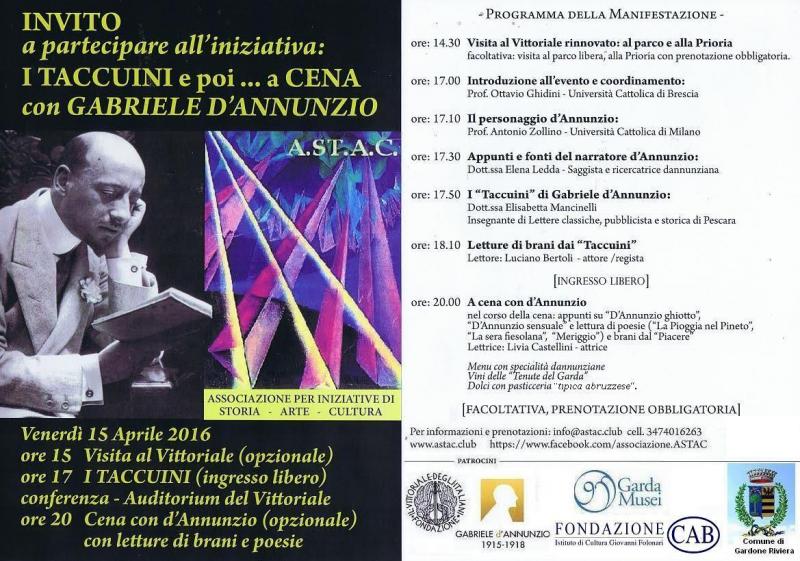 Si terrà il 15 aprile prossimo presso il Vittoriale degli Italiani l'evento "I TACCUINI E POI…A CENA CON GABRIELE D’ANNUNZIO"a cura dell'Associazione A.St.A.C. (Associazione per iniziative di Storia, Arte e Cultura) di Brescia con il patrocinio della Fondazione del Vittoriale degli Italiani, di Garda Musei, del Comune di Gardone Riviera e della Fondazione CAB informa. Poco si è scritto sull’argomento e poco si è affrontato in convegni, ma la discussione sui "Taccuini" rappresenta un passo fondamentale nella ricostruzione della personalità del Vate e della sua vita. "Di carteggi, biglietti, diari, epistolari Gabriele D'Annunzio ne ebbe moltissimi tanto da essere definito un vero e proprio grafomane. Scriveva sempre e a tutti : alle amanti, ai familiari, agli amici, agli editori, ai compagni di vecchie avventure ma anche alla cuoca, all’autista. Usava portare con sé nelle tasche, ovunque andasse, veri e propri quadernetti per poter annotare, in ogni momento, qualsiasi osservazione e pensiero gli passasse per la mente. Dei luoghi amava riferire con minuzia tutti i particolari, ciò non gli impediva tuttavia la loro trasfigurazione da spazi reali a luoghi mitizzati. Anche nei i Taccuini quei paesaggi appena accennati, schizzati , disegnati o colorati, testimoniano tale mitizzazione." Come da programma le fasi dell'evento sono tre, ben distinte. La prima faseriguarda la visita al Vittoriale, gratuita per quanto riguarda i giardini, la nave, la tomba ecc., a pagamento e su prenotazione per la visita guidata alla Prioria, l'abitazione di d'Annunzio. Per capire la personalità di d'Annunzio, consigliamo caldamente la visita alla Prioria: dentro c'è tutto il suo mondo, compreso i preziosi manoscritti della sua biblioteca. La visita al Vittoriale è facoltativa, ma può essere l’occasione: per chi non l’ha mai visto, di accedere all’imprevedibile, variopinto ma anche profondamente istruttivo mondo del "Vate"; per chi lo ha visitato in tempi lontani, per rivederlo nella sua rinnovata veste, con particolare riferimento alle stanze della Prioria una volta non visitabili; per chi lo ha già visitato di recente, di ripercorrere e riscoprire un mondo che ogni volta sorprende nella sua imprevedibilità, nel suo eclettismo artistico, intellettuale e della sfera intima, personale. La visita è a ingresso limitato, ogni turno massimo 10 persone per la durata di un’ora circa. Il costo è di 16 euroe il gruppo dell' A.St.A.C.è prenotato per le ore 14 del 15 aprile. Essendo i posti limitati è pertanto importante prenotare con anticipo presso la segreteria della stessa associazione. La seconda fase(a ingresso libero) si svolgerà presso l’Auditorium del Vittoriale a partire dalle ore 17 fino alle ore 19 e prevede appunto la conferenza sui "Taccuini" con letture di brani tratti dai taccuini del Vate. Interverranno il Prof. Antonio Zollino dell’Università Cattolica di Milano con la relazione "Ilpersonaggio d'Annunzio", la Dott.ssa Elena Ledda, Saggista e Ricercatrice dannunziana, con la relazione "Appunti e fonti del narratore d'Annunzio", la Prof.ssa Elisabetta Mancinelli¸ Insegnante di Lettere Classiche, pubblicista e storica di Pescara, con la relazione sui "Taccuini" che verrà man mano alternata con letture di brani tratti da "Taccuini" letti da Luciano Bertoli, attore di consumata esperienza e di indiscussa bravura. Coordinatore della conferenza sarà il Prof. Ottavio Ghidini dell'Università Cattolica di Brescia. La terza fase (facoltativa, con prenotazione obbligatoria) prevede la sera alle 20, presso il delizioso Hotel Atelier Classic di Gardone Riviera, la cena dannunziana con specialità care al poeta. Durante la cena saranno lette alcune poesie (La pioggia nel pineto, La sera fiesolana, Meriggio ecc.) e brani dal "Piacere" a cura della bravissima e appassionata attrice Livia Castellini. Il costo della cena è di 38 euro. Per chi viene da lontano sono previsti pacchetti tutto incluso compreso il pernottamento presso lo stesso Hotel Atelier Classic (come si può consultare nella nostra area Facebook). "Gabriele d’Annunzio non fu certamente un grande mangiatore. Era per l’essenzialità della cucina, si nutriva più di sapori specialmente quelli della sua terra, umili e semplici, quasi volesse spogliarsi dei suoi panni per riappropriarsi della sua memoria storica e delle proprie origini. Il cibo nel corso della sua esistenza divenne poi un ornamento estetico che accompagnava le attività pratiche amorose e, dopo averle espletate, chiedeva alla cuoca dei piatti speciali raffinati magari adatti alla carnagione dell’amante. Essendo dotato di forte senso estetico e del colore, i cibi dovevano essere semplici, ma presentati in modo splendido, con cura per l’allestimento del piatto e con le stoviglie adeguate." ha raccontato Elisabetta Mancinelli, relatrice di un passato convegno.