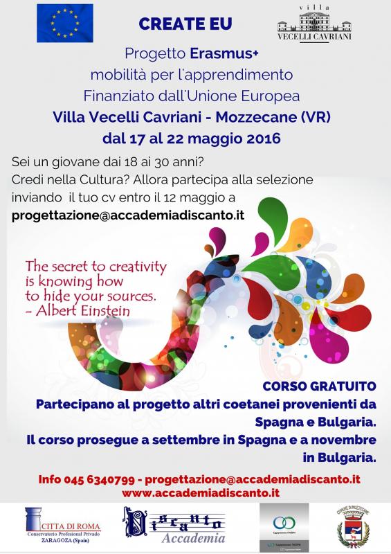 Il progetto Create Eu, in programma dal 17 al 22 maggio 2016 presso Villa Vecelli Cavriani di Mozzecane, è un progetto finanziato dall'Unione Europa, all'interno dell'Azione Chiave "Mobilità per l'apprendimento" del programma Erasmus+, promosso dalla fondazione "Città di Roma" di Saragozza, Accademia Discanto e Association Civil Initiative for Social Development and Integration di Sofia.