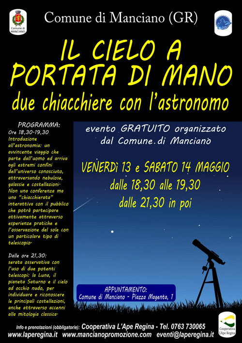 L’Assessorato al turismo del Comune di Manciano e la coop. L’Ape Regina di Acquapendente, vi invitano a questi due appuntamenti dedicati alle stelle.