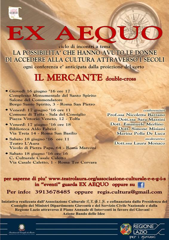 Ex Equo - La possibilità che hanno avuto le donne di accedere alla cultura attraverso i secoli. É questo l'argomento che dal 16 al 18 giugno verrà affrontato in un ciclo di conferenze interattive accompanate dalla proiezione del cotometraggio "Il Mercante bouble-cross" di Maina Polla de Luca.