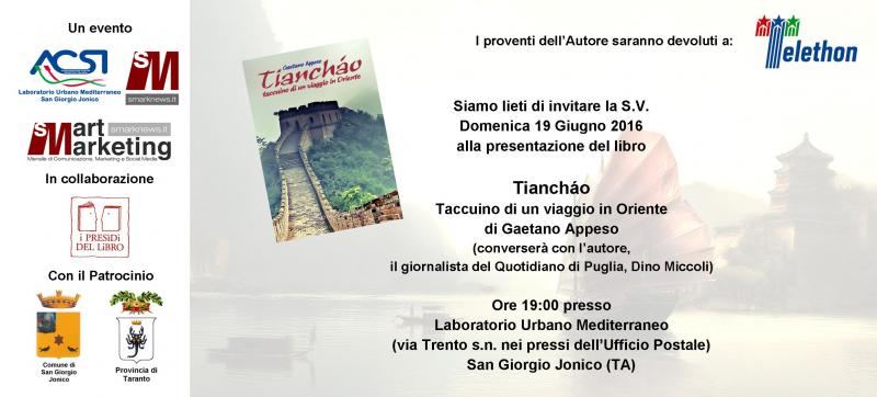 Il Laboratorio Urbano Mediterraneo, in occasione del finissage di “News-Cover” e della mostra “Arte Poliedrica” del designer sangiorgese Andrea De Luca, ospitata in questi giorni all’interno del Laboratorio, chiude questi eventi artistici con un’altra iniziativa culturale: la presentazione del libro "TIANCHÁO. Taccuino di un viaggio in Oriente" di Gaetano Appeso.