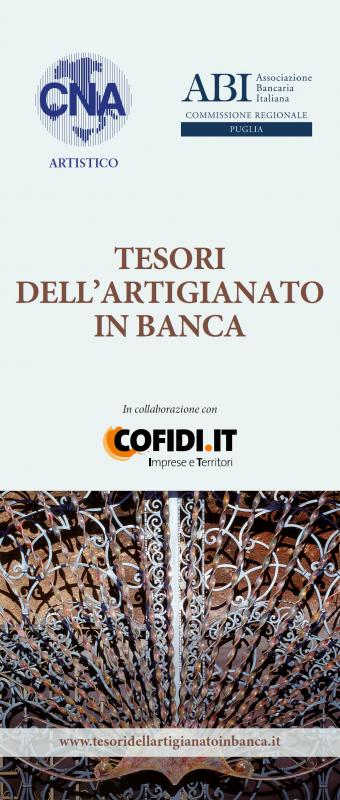 S’inaugura martedì 21 giugno presso la sede del Banco di Napoli in piazza Luigi di Savoia, 16 a Bari, alla presenza di Giuseppe Ghisolfi, vicepresidente nazionale ABI, della presidenza regionale ABI PUGLIA, diAndrea Santolini, presidente di CNA Artistico nazionale, di Maria Concetta Malorzo, presidente regionale di CNA Artistico Puglia, e di Francesca Soardi, presidente di CNA PUGLIA, «Tesori dell’artigianato in banca», la rassegna sull'artigianato artistico pugliese che vedrà esposte opere come strumenti medievali, sculture in vetro, manufatti in cartapesta e ceramica artistica, e icone bizantine.