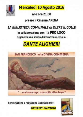 Serata culturale al Cineteatro Arena. San Francesco nella Divina Commedia: "... e al suo corpo non volle nessuna bara". La Divina Commedia con commento e recita del Professor G. Piantoni. A cura biblioteca di Oltre il Colle in collaborazione con la ProLoco.