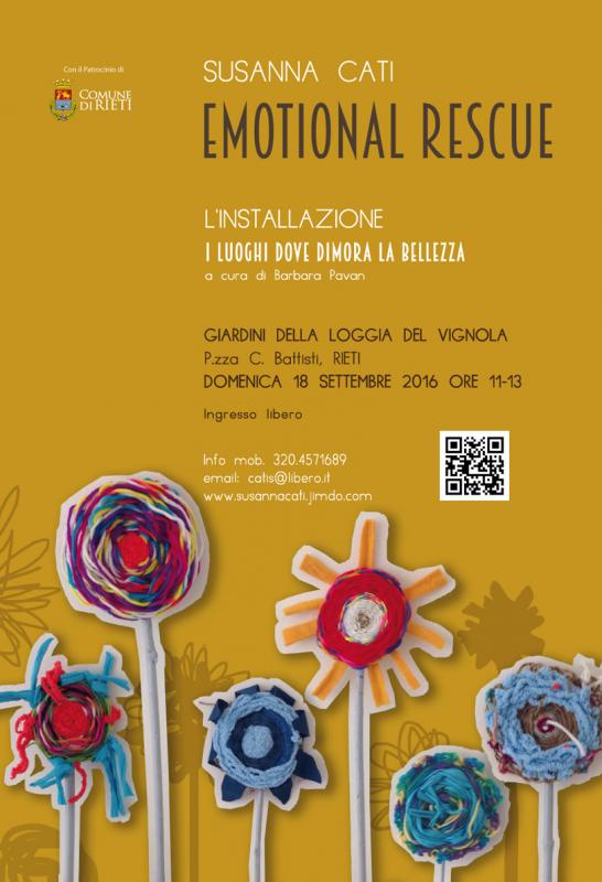 Sulla scia di queste riflessioni SUSANNA CATI ha creato il progetto ‘Emotional rescue’ che sarà allestito, a cura di Barbara Pavan, con il Patrocinio del Comune, domenica 18 settembre 2016 a Rieti, presso i Giardini della Loggia del Vignola, in piazza Cesare Battisti, dalle ore 11 alle 13.