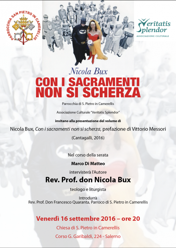 La Parrocchia di San Pietro in Camerellis e l’Associazione Culturale “Veritatis Splendor” hanno organizzato a Salerno per venerdì 16 settembre, alle ore 20, presso la Chiesa di San Pietro in Camerellis (in Corso G. Garibaldi 224) un incontro-conversazione con il Rev. Prof. Don Nicola Bux, teologo e liturgista, autore del recente volume Non si scherza con i sacramenti (Cantagalli, Siena 2016). Nel libro, che offre un contributo significativo alla riflessione su un tema di scottante attualità quale quello della comunione ai divorziati risposati, Don Nicola Bux si sofferma sull’importanza della dimensione sacramentale nella vita del credente, evidenziando le ragioni teologiche a sostegno del primato della dottrina cristiana rispetto alle esigenze della pastorale. Nel corso della serata, dopo una breve introduzione a cura di Don Francesco Quaranta, Parroco di S. Pietro in Camerellis, sarà il Prof. Marco Di Matteo, Presidente dell’Associazione Veritatis Splendor, a intervistare don Nicola Bux sui temi sviluppati nel suo volume.
