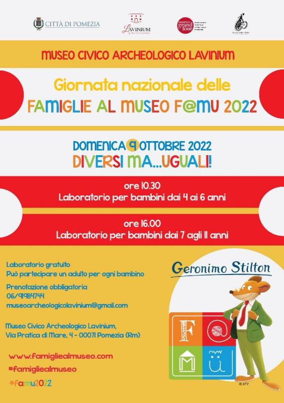 Anche quest’anno il Museo Civico Archeologico Lavinium partecipa a F@Mu 2022 e vi invita domenica 9 ottobre a festeggiare la Giornata nazionale delle Famiglie al Museo partecipando al laboratorio didattico “Diversi ma...uguali”, con l’obiettivo di sostenere la diversità come valore e strumento unico di arricchimento sociale e di inclusione.