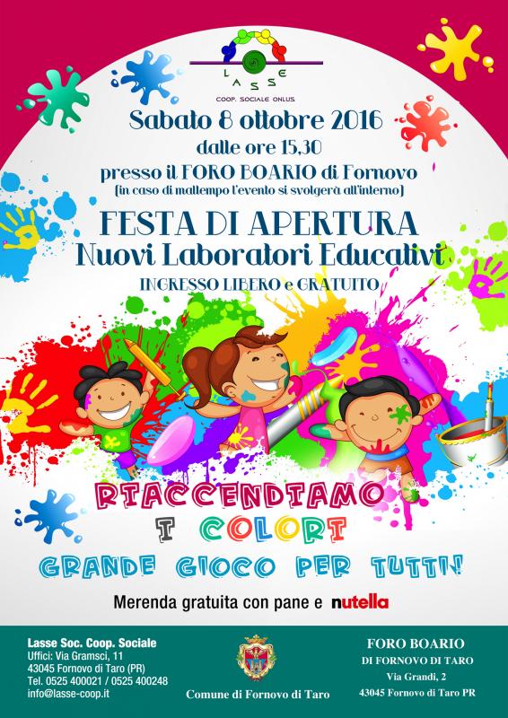 Sabato 8 ottobre la Cooperativa Lasse festeggia la nuova apertura, all’insegna dei colori e dell’intrattenimento per bambini di tutte le fasce d’età. I nuovi laboratori educativi saranno infatti presentati al Foro Boario di Fornovo a partire dalle 15,30. In caso di maltempo l’evento si svolgerà comunque all’interno degli spazi gestiti dalla Cooperativa e messi a disposizione dal Comune.