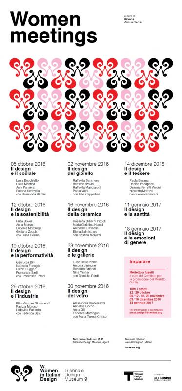 Nell’ambito della nona edizione W. Women in Italian Design (aperta fino al 19 febbraio 2016), Triennale Design Museum dal 5 ottobre 2016, tutti i mercoledì alle 18.30, presenta Women Meetings, un ciclo di incontri, a cura di Silvana Annicchiarico, dedicato ad approfondire specifici temi e figure della progettualità al femminile.