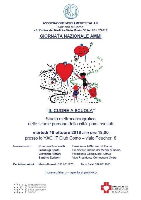 Martedì 18 ottobre alle 18 presso lo Yacht Club di Como, in occasione della Giornata Nazionale Ammi, la sezione di Como dell’Associazione Mogli Medici Italiani organizza il convegno “Il cuore a scuola. Studio elettrocardiografico nelle scuole primarie della città: primi risultati”.