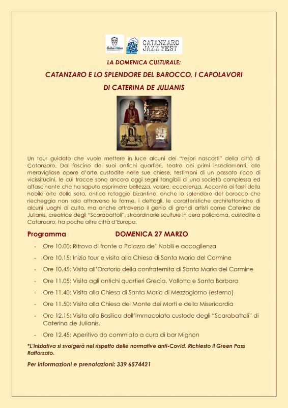 Quello di domenica 27 marzo, dal titolo “Catanzaro e lo splendore del barocco, i capolavori di Caterina de Julianis”, sarà un tour guidato che vuole mettere in luce alcuni dei “tesori nascosti” della città dei tre colli, purtroppo poco conosciuta e poco valorizzata, ma in possesso di un grande potenziale dal punto di vista artistico - culturale. Durante la visita guidata, dal fascino dei suoi antichi quartieri, teatro dei primi insediamenti, si passerà alla scoperta delle meravigliose opere d’arte custodite nelle sue chiese, testimoni di un passato ricco di vicissitudini, le cui tracce sono ancora oggi segni tangibili di una società complessa ed affascinante che ha saputo esprimere bellezza, valore, eccellenza. Accanto ai fasti della nobile arte della seta, antico retaggio bizantino, occorre ricordare anche lo splendore del barocco, che riecheggia non solo attraverso le forme, i dettagli, le caratteristiche architettoniche di alcuni luoghi di culto, ma anche attraverso il genio di grandi artisti come Caterina de Julianis, autrice degli “Scarabattoli”, straordinarie sculture in cera policroma, custodite a Catanzaro, tra poche altre città d’Europa.