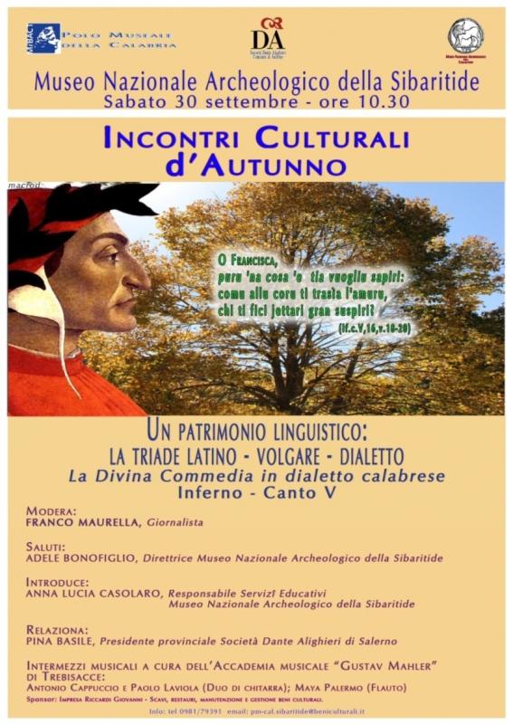 Protagonista di questo primo incontro è Pina Basile, ricercatrice e insegnante presso la cattedra di Linguistica italiana dell’Università di Salerno, nonché presidente provinciale della società “Dante Alighieri” di Salerno, che terrà una relazione dal titolo: Un patrimonio linguistico: la triade latino- volgare -dialetto. La Divina Commedia in dialetto calabrese. Inferno, canto V.
