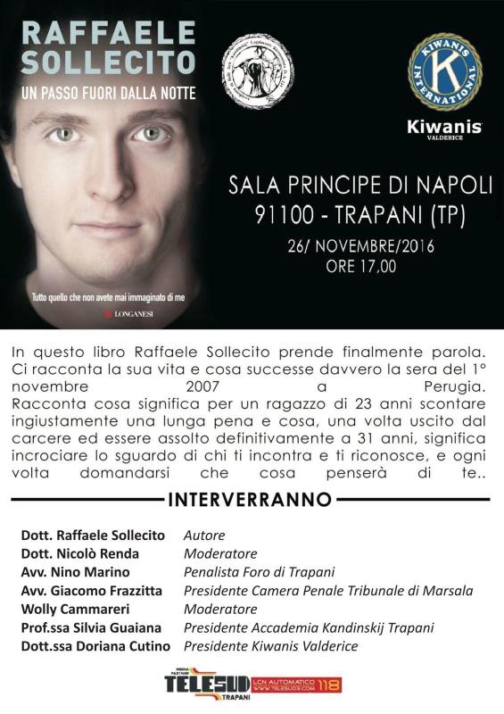 Raffaele Sollecito sarà a Trapani sabato 26 novembre per presentare il suo libro “Un passo fuori dalla notte – Tutto quello che non avete mai immaginato di me”, edito da Longanesi. L’incontro si terrà alle ore 17,00, nei locali dello storico edificio “Principe di Napoli, in via del Cappucini n.7.