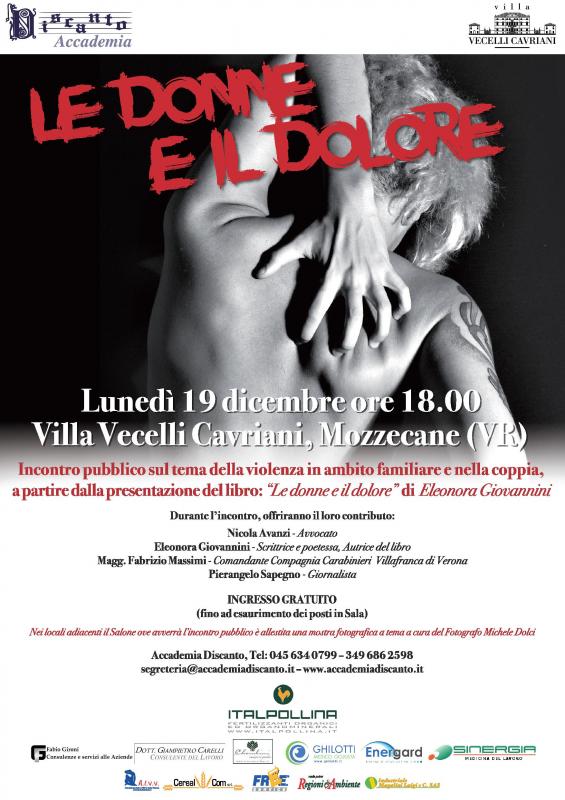 L’Accademia Discanto organizza, per la giornata di lunedì 19 dicembre, a partire dalle ore 18.00, presso Villa Vecelli Cavriani di Mozzecane (Verona) un incontro pubblico a partire dalla presentazione del nuovo libro di Eleonora Giovannini: “Le donne e il dolore”.