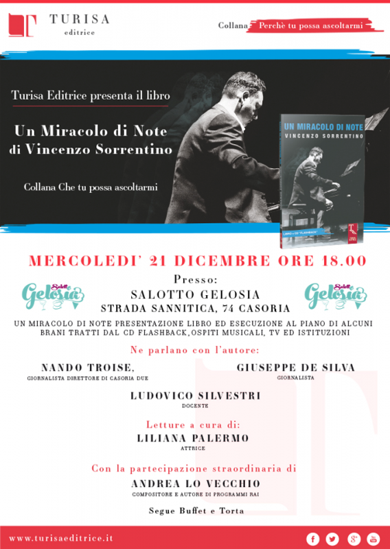 Grande attesa per mercoledi 21 dicembre al salotto Gelosia di Casoria, strada statale sannitica, 74. A partire dalle ore 18:00, l’accogliente sala ospiterà il maestro Vincenzo Sorrentino che presenta al pubblico il suo libro “Un miracolo di note” edito dalla casa editrice Turisa. Classe ’82, pianista, compositore, direttore d’orchestra, il maestro sin da piccolo eccelle per la sua dote straordinaria: l’orecchio assoluto, che gli consente di riprodurre fedelmente ciascun suono. Riesce ad interpretare infatti note di puro romanticismo lirico, suoni che avvolgono ed accarezzano sensibilmente il cuore. Il libro è una ricca ed emozionante autobiografia , un’opera suggestiva, dove le pagine ripercorrono le tappe più significative della sua vita personale ed artistica. Durante la presentazione saranno letti alcuni dei passaggi più emblematici di “Un miracolo di note”; utile strumento e viatico per coloro che intendono avvicinarsi all’impegnativo mondo della musica. L’autore sa raccontare i sentimenti con semplicità , forza e tanto entusiasmo attraverso note che fanno vibrare l’anima. Sarà possibile inoltre ascoltare i brani tratti dalla sua ultima fatica, il cd Flashback. Ad inaugurare il piacevole incontro, il direttore di Casoria Due, Nando Troise, il giornalista Giuseppe De Silva, e il docente Ludovico Silvestri. Pagine del libro Un miracolo di note, verranno magistralmente interpretate dall’attrice Liliana Palermo. Numerosi gli ospiti a sorpresa tra cui esperti di musica, tv, istituzioni. Ospite d’eccezione, Andrea Lo Vecchio, celebre compositore, autore televisivo Rai. Previsto, in chiusura, un brindisi natalizio con un gustoso buffet ed una torta speciale preparati dal proprietario Vincenzo Giglio.