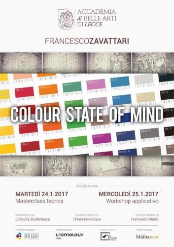 Se in quell'occasione l'intervento di Zavattari si svolse come una panoramica di carattere generico sulla propria attività, questa nuova masterclass si annuncia decisamente più strutturata e complessa. Promosso dal Comitato Studentesco dell'Accademia e coordinato da Chiara Bevilacqua e Francesco Vitiello, il progetto educativo dal nome "Colour State of Mind" prevede due intense giornate di lavoro con gli studenti impegnati sia dal punto di vista teorico che pratico. Protagonista assoluto, il colore, in tutte le sue espressioni e accezioni.