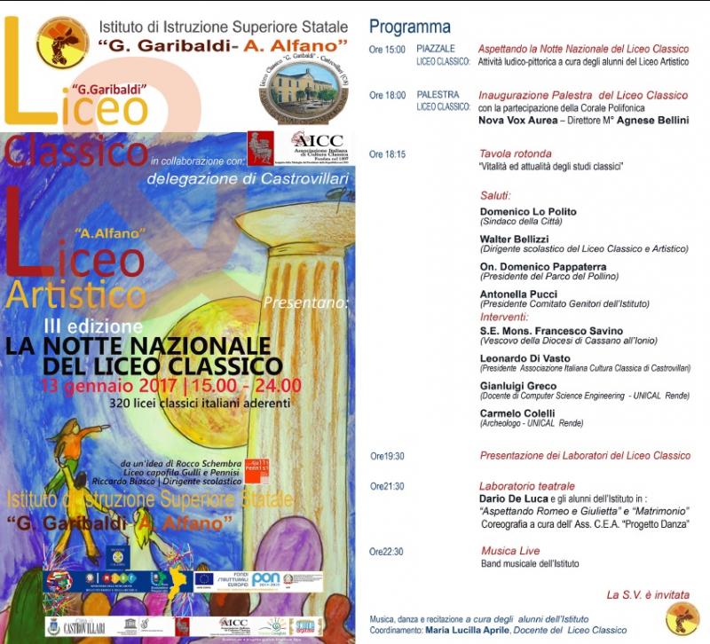Nel'edificio dello storico Liceo Classico di Castrovillari, si svolgerà la 3^ edizione della “Notte Nazionale del Liceo Classico” in concomitanza con altri 320 Licei Classici di tutta l’Italia che hanno aderito all’iniziativa.