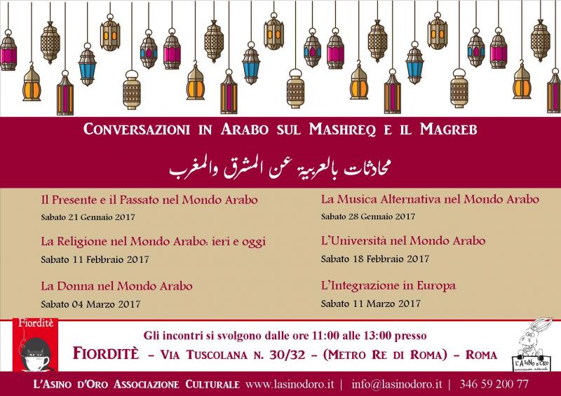 L’Associazione Culturale L’Asino d’Oro organizza una serie di incontri/conversazioni sulla Storia e la Cultura del Mondo Arabo, interamente condotti in lingua araba da un archeologo siriano. Le conversazioni sono rivolte all’approfondimento della conoscenza di questo variegato mondo e contemporaneamente al potenziamento linguistico, per imparare nuovi termini ed arricchire il proprio personale vocabolario. I partecipanti saranno infatti chiamati attivamente ad intervinire e discutere sui differenti temi di volta in volta affrontati, per favorire un coinvolgimento diretto. Il corso avrà quindi un duplice scopo: da un lato far avvicinare i partecipanti alla cultura del Mondo Arabo e dall’altro fornire un importante arricchimento linguistico. Il corso potrà essere seguito nella sua totalità oppure si potrà scegliere il singolo incontro, trattando infatti ciascuno una tematica a sé stante.