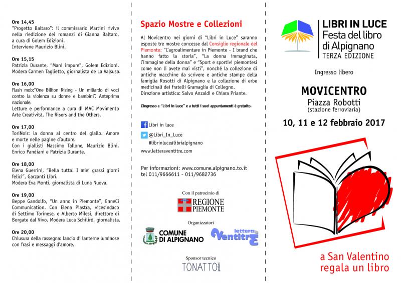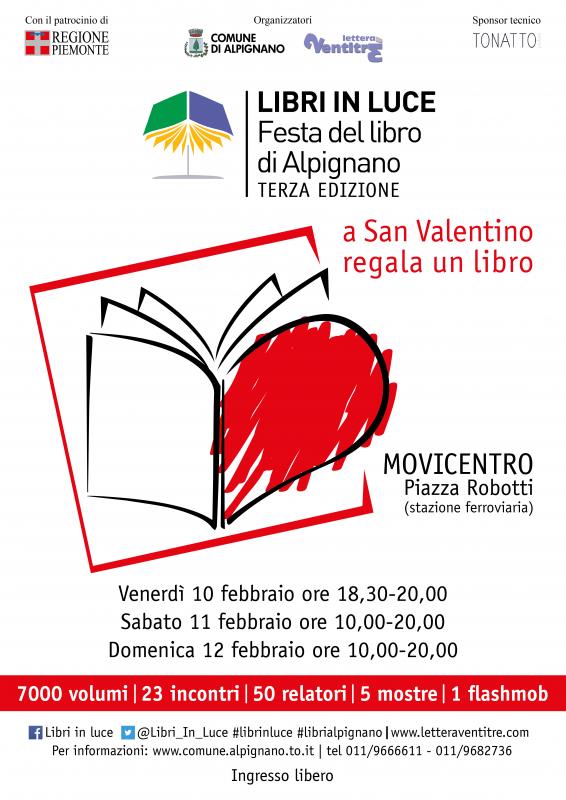 "A San Valentino regala un libro" è il tema dell'edizione 2017 di Libri in Luce, organizzata da Lettera Ventitré e Comune di Alpignano, con il patrocinio della Regione Piemonte.